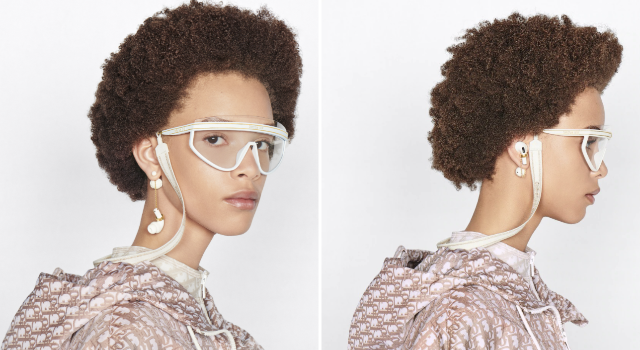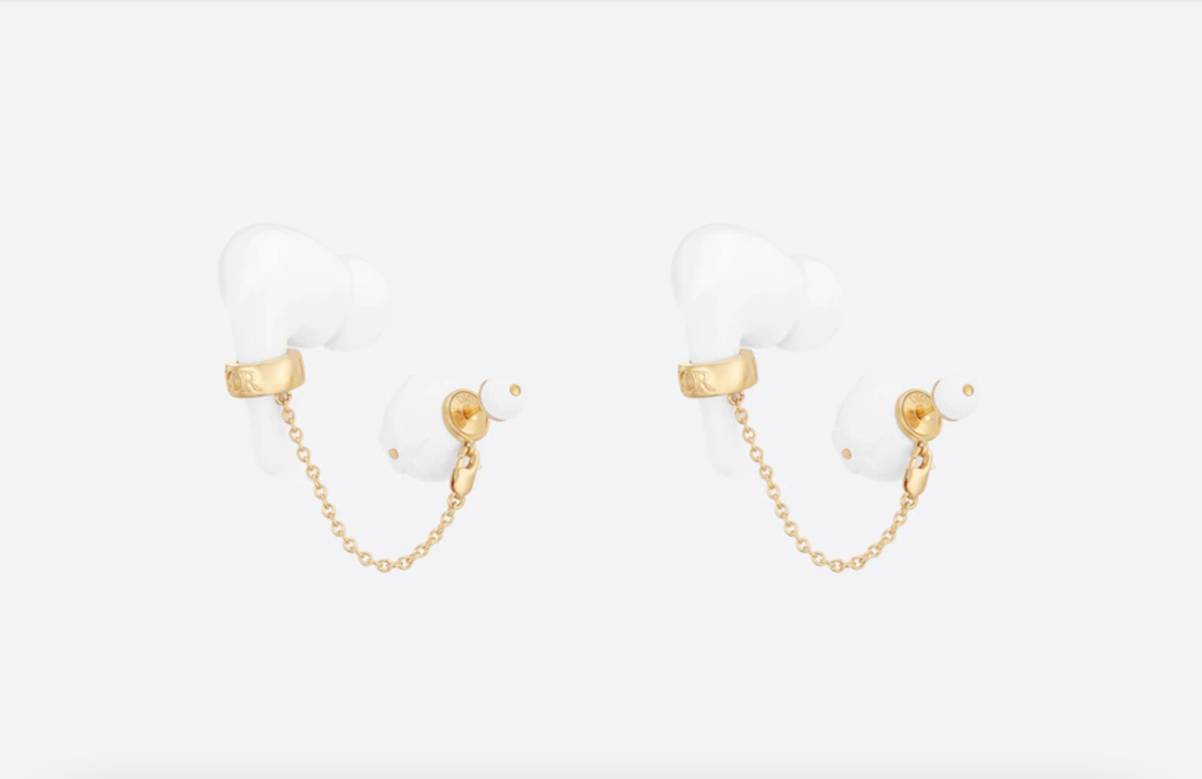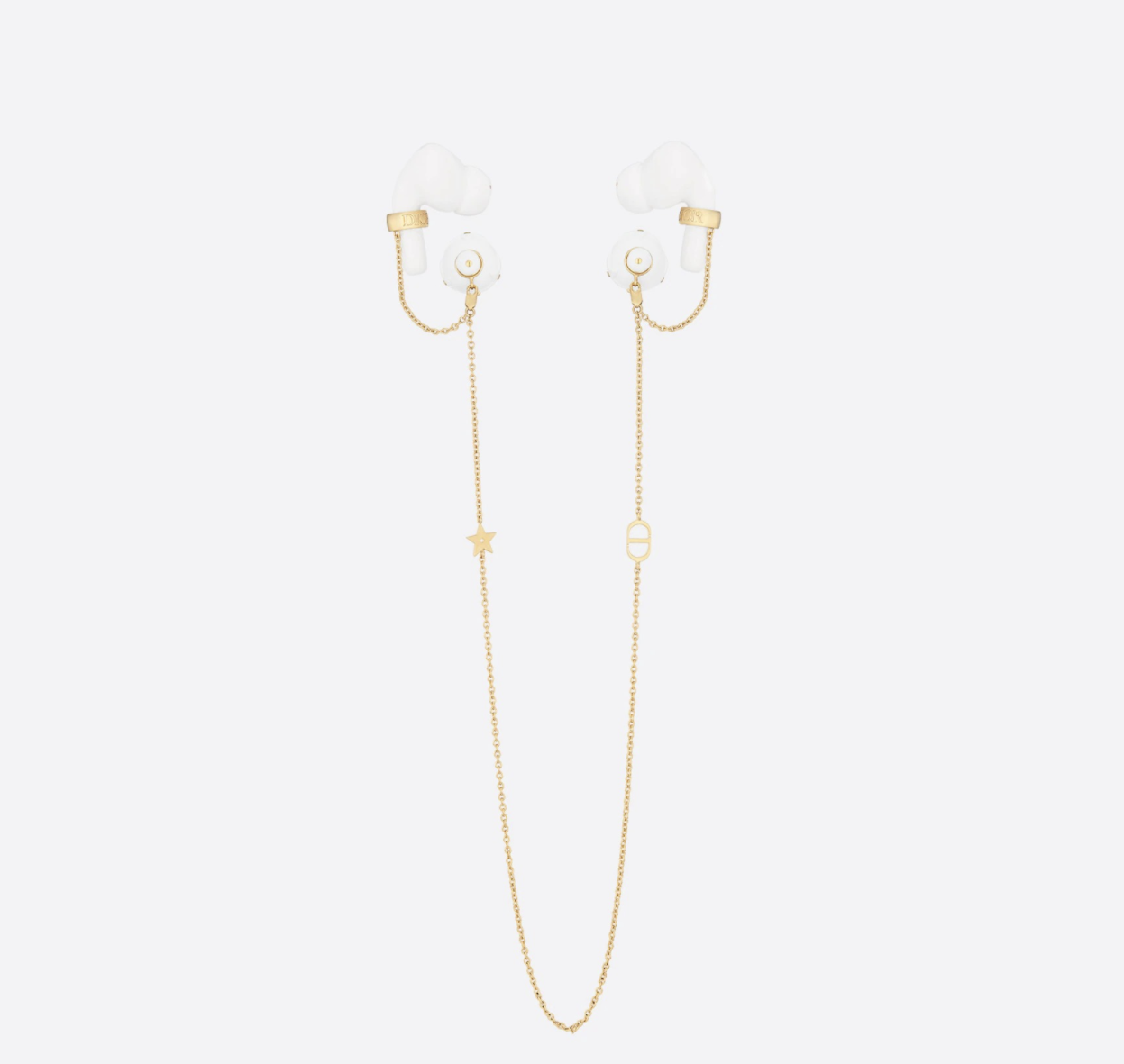 由第三代AirPods的发布延伸出的搭配耳机的时髦饰物在时尚圈掀起了一阵阵热潮。本次迪奥亮相了一组金光闪闪,造型独特的耳机耳环“D-Vibe Dior Tribales” ,金扣,金链与AirPods、珍珠梦幻组合,成为了Dior 2022早春系列中的一大亮点。