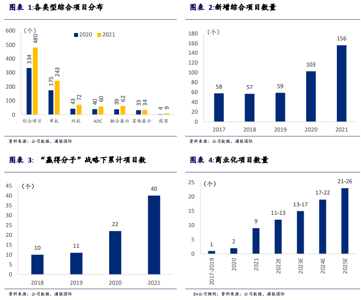 据浦银国际证券于2022年1月18日发布的研报,药明生物管理层参加活动时介绍,药明生物2021年新增156个综合项目(此前公司指引120个,2020年新增103个),其中非新冠项目新增143个;其中138个新增项目来自内生增长,其余18个来自苏桥生物收购;年末综合项目总数达480个(包括182个潜在全球首创药),其中商业化项目9个,临床III期32个,疫苗9个(包括两个mRNA疫苗项目)。目前公司新冠项目超20个(包括3个疫苗项目),其中有3款中和抗体已显示对Omicron(奥密克戎)有效。
