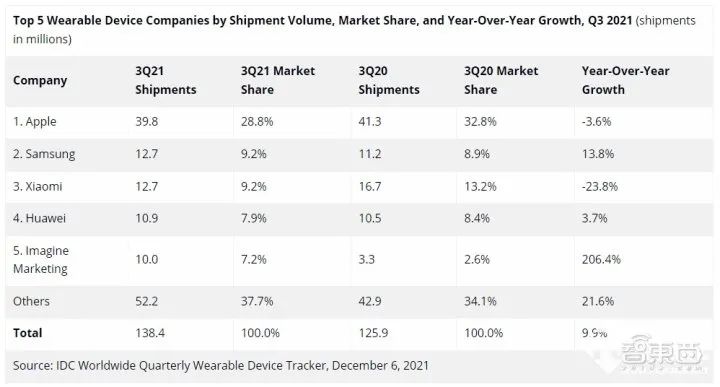 2021年Q3全球可穿戴市场出货量,数据来源:IDC