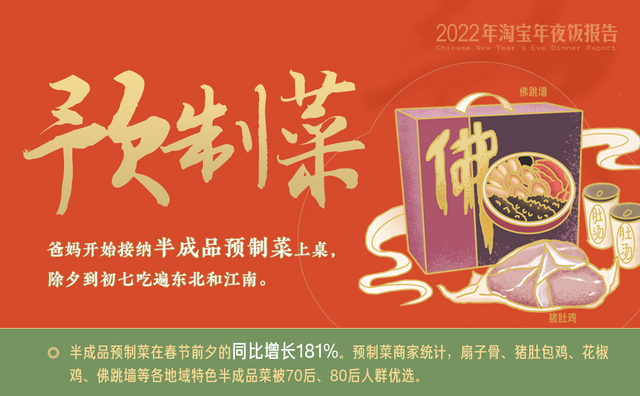 前不久淘宝联合中国农业科学院农产品加工研究所、第三方食品认证机构恒生发布的《2022年淘宝年夜饭报告》中也提到,今年预制菜销量再次上涨,同比去年增长超100%,成为年夜饭最火菜式之一。