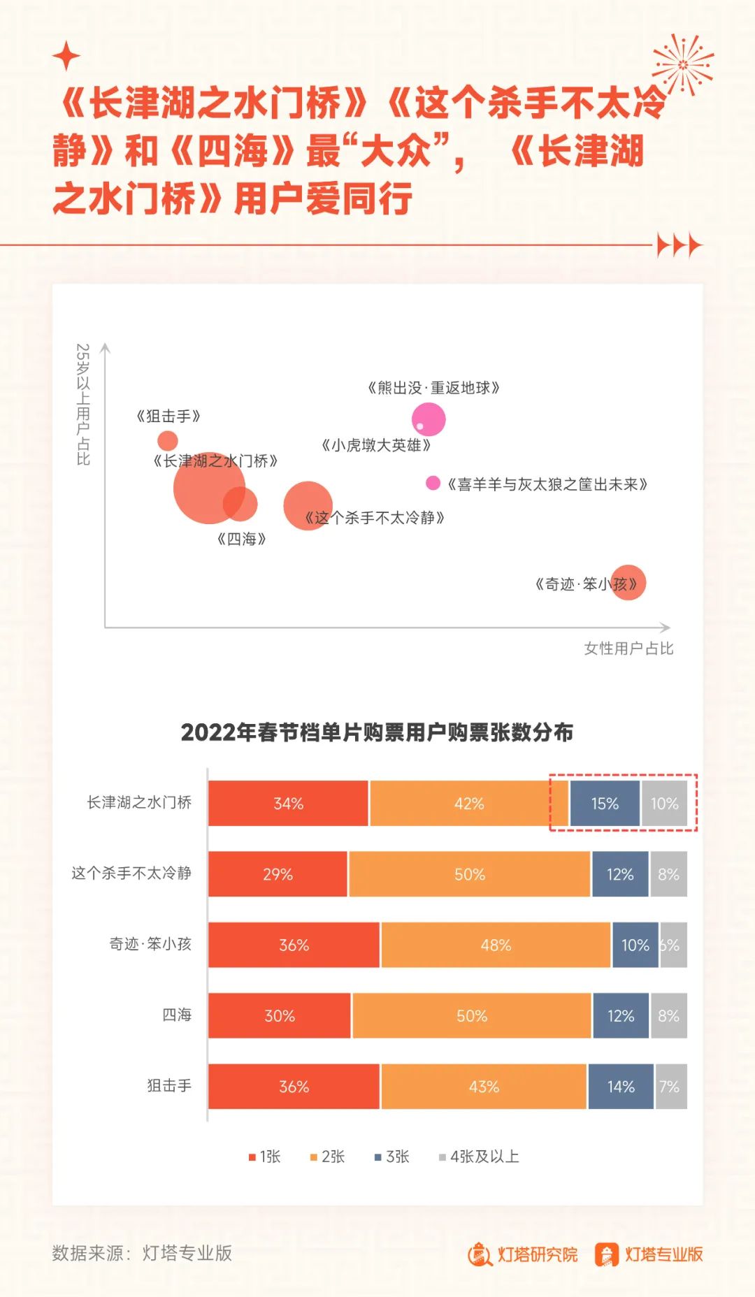 从社交维度来看,《长津湖之水门桥》《这个杀手不太冷静》和《四海》最“大众”。《报告》资料显示,这3部电影三张及以上的用户购票比例分别为25%、20%和20%,说明这三部电影的社交属性更强,更适合多人观影讨论。