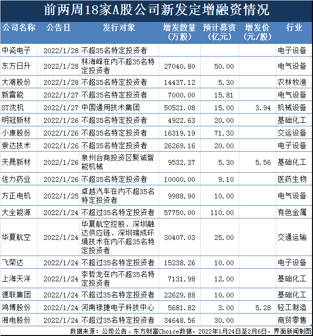 2022年1月24日至2月6日(含春节假期),大全能源(688303.SH)、小康股份(601127.SH)、东方日升(300118.SZ)、湘电股份(600416.SH)、华夏航空(002928.SZ)等18家A股上市公司披露新的定增计划,累计募资约421.81亿元。