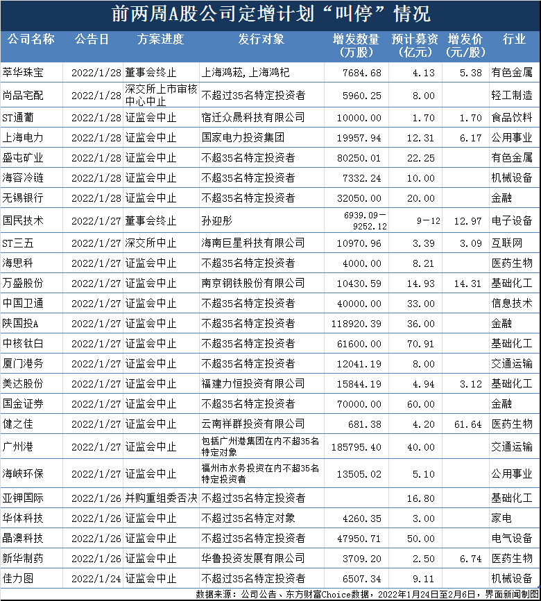 另据了解,萃华珠宝(002731.SZ)、国民技术(300077.SZ)等公司因市场环境变化等原因终止其定增事宜。亚钾国际(000893.SZ)拟发行股份及支付现金方式购买北京农钾资源科技有限公司的56%股权事项,未获证监会审核通过;该公司董事会决定在老挝100万吨改扩建项目近期达产后,继续推进本次交易。