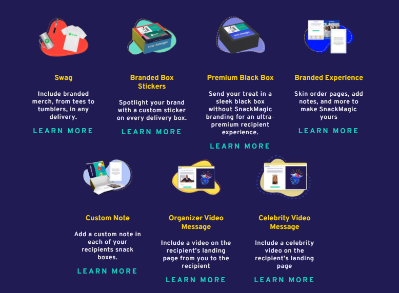 Snack Magic操作非常简单。你只需要设置每个人的预算,留下他们的邮箱,然后发送给收件人链接。无论订阅者想要给一个人还是100000人送礼物,每个收件人都可以自由的通过链接从Snack Magic的零食库中筛选更符合自己胃口的零食,组成完全个性化的盒子,由Snack Magic组装寄送。Snack Magic是唯一一家可以让收礼物的人自己选择,选择他们能得到什么样礼物的服务商,从根本上让送礼物变得双赢。