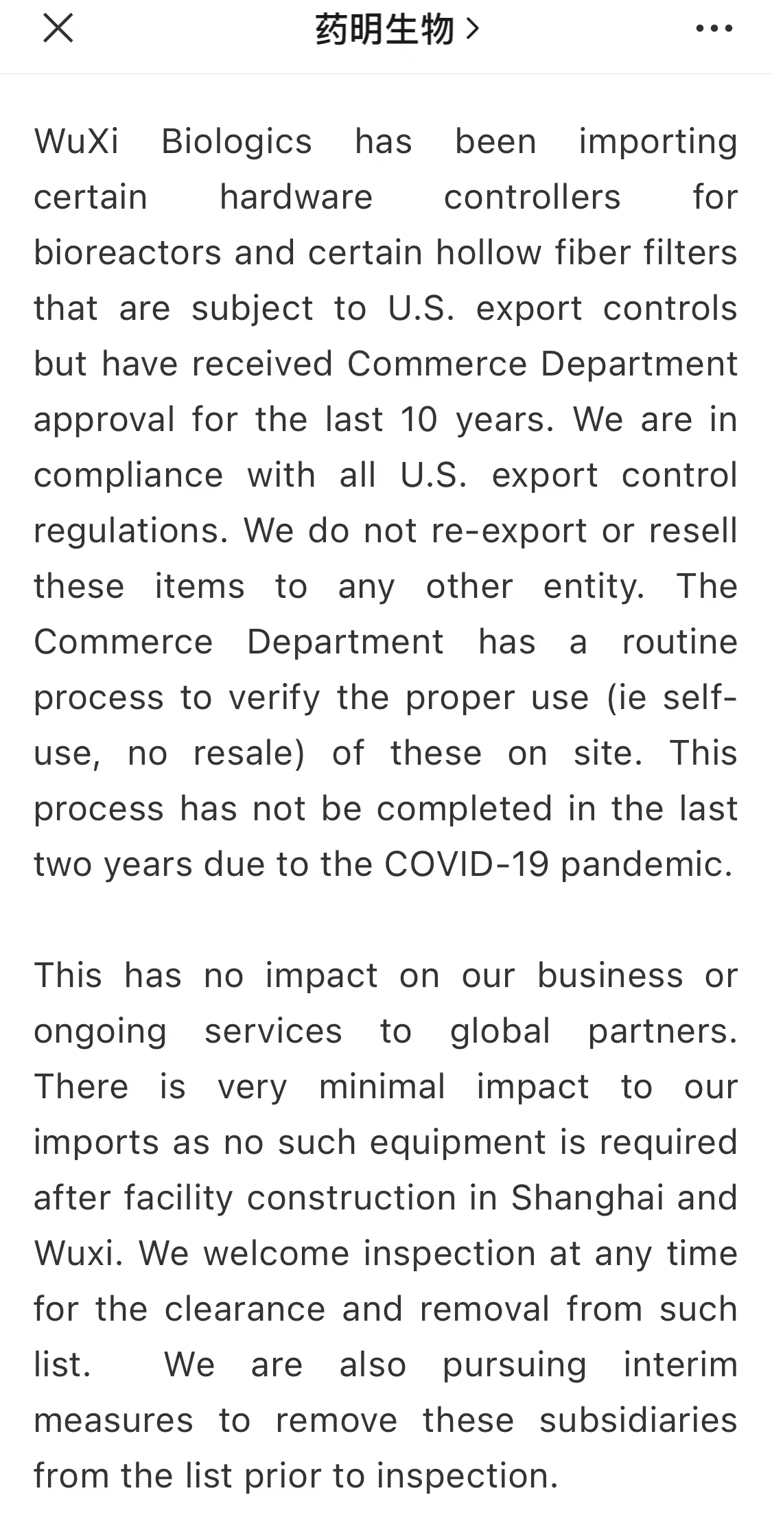 据透露,药明生物在过去的10年里一直在进口生物反应器的某些硬件控制器和某些中空纤维过滤器,这些产品受到美国出口管制,但已获得美国商务部的批准。药明生物称,公司遵守所有美国出口管制法规,不会转口或转售这些项目给任何其他实体;商务部有一套常规程序来核实这些东西是否能在该网站得到正当使用(即自用,不得转售),由于新冠疫情,这一过程在过去两年中尚未完成。