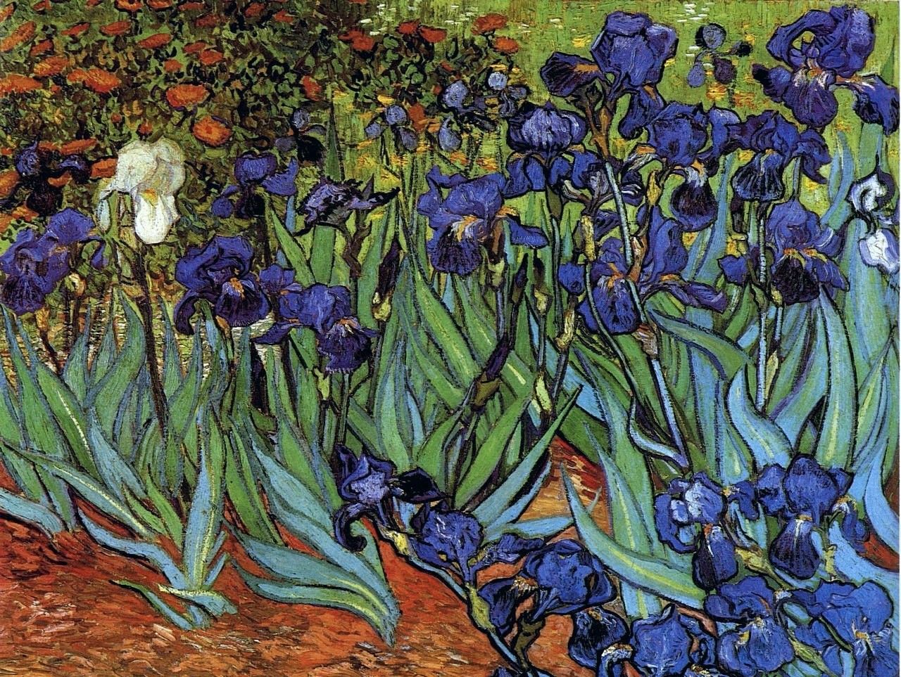 梵高似乎也如同喜欢向日葵一样喜欢画这种植物,画面中灿烂的蓝紫色鸢尾花十分突出,它的花形恰似一群翩翩起舞的蝴蝶;作者巧妙地将它那郁郁葱葱的粉绿色叶子做了低调的处理,与远处的花草一同衬托出了鸢尾花的生动与灵性;再有地上红赤泥土的陪衬打破了画面冷色的调子,使得色彩对比强烈且和谐并富有律动,色调也极其明亮,整幅画面富有活力,洋溢着清新的气息。