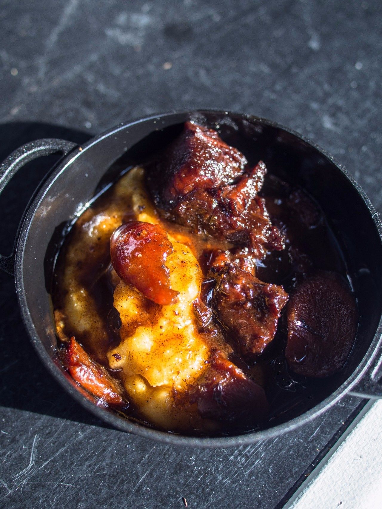 厨房慢慢溢出了肉的香,是冰糖的焦糖味儿和着玉质般质感的肉洋溢出的肥香中一种不曾相识的味儿,闭上眼睛,这种味道却氤氲成了不断旋转的紫,优雅且暧昧。菜端上来了,更让我惊奇的是一盘“松露紫薯汁和奶油南瓜栗子汤”,这完全就是一幅梵高“夜空”的再现:深蓝色的天空;一些黄色的星与闪光的橘黄色的月亮形成旋涡,天空变得活跃起来。