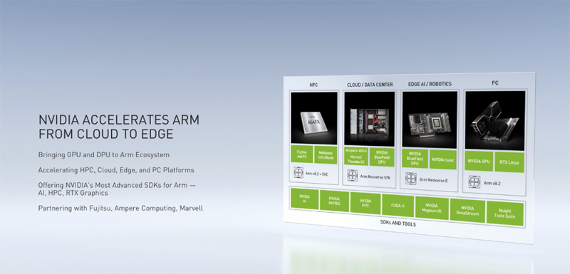 对于FTC的起诉,英伟达、Arm和软银则联合发布了长达49页的辩护书,强调Arm当前正在面临越来越高的研发成本,但由于Arm在移动处理器等主要市场的份额基本饱和,其IP授权和版税收入难以快速增加,面临着强大的竞争压力。而对于英伟达来说,它没有动机阻碍技术创新和不公正对待Arm客户。相反,英伟达认为双方的合并将加速人工智能等新技术的发展。除了不停强调Arm的独立和开放外,借收购东风,英伟达开始全面布局Arm生态。在2020年交易公布一个月后的GTC大会上,黄仁勋宣布在三个方面进行投资,包括将包括将GPU和DPU迁移到Arm生态上、加速高性能计算与云边端平台、向Arm提供英伟达AI、HPC、RTX引擎等先进SDK。