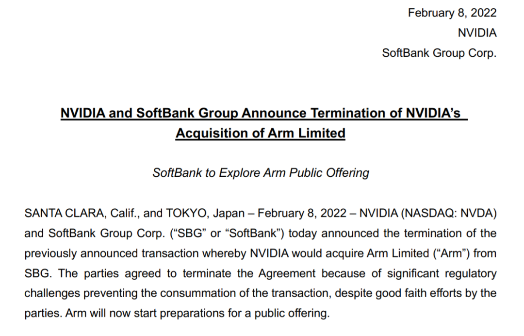 智东西2月8日报道,今天下午,软银、英伟达和Arm正式发表声明,宣布终止此前英伟达从软银收购Arm的交易。