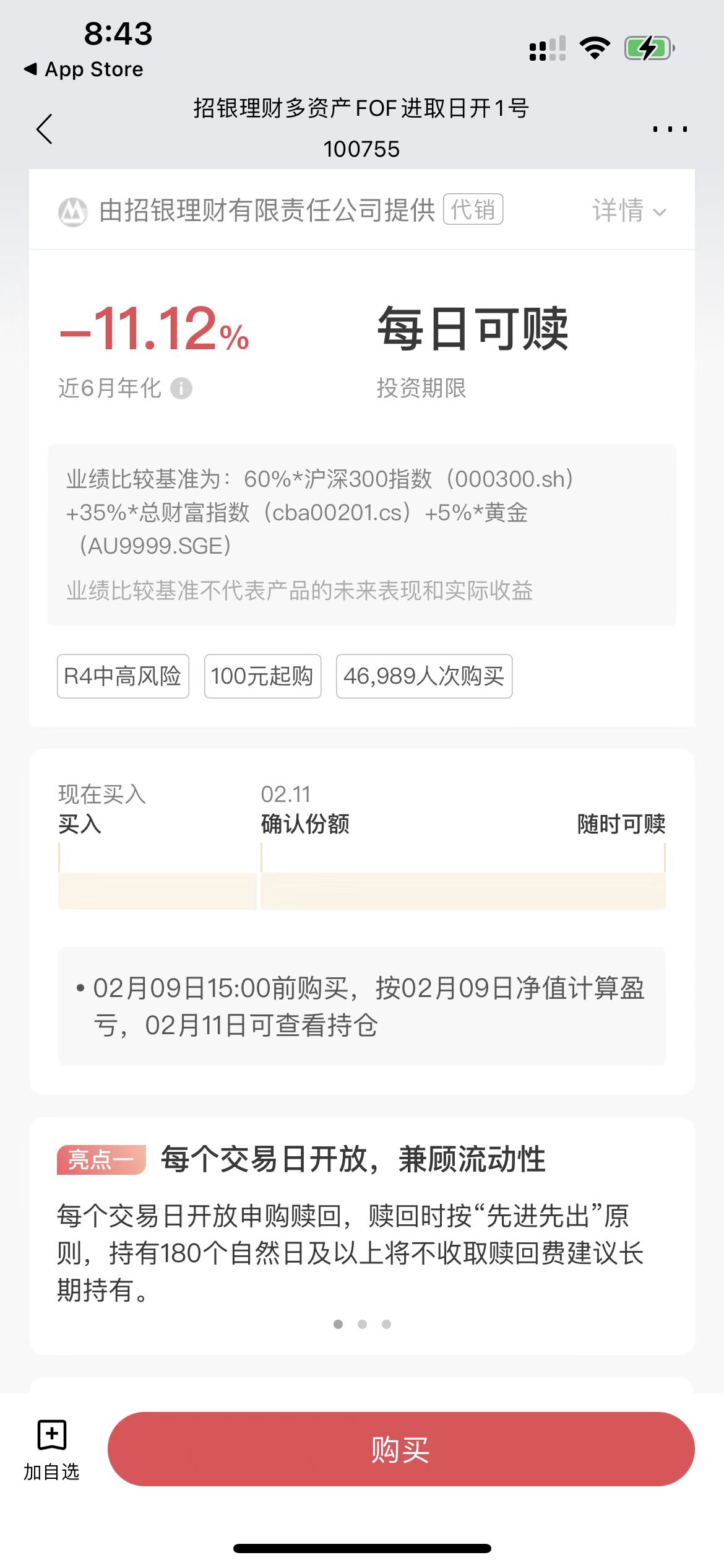 据券商中国报道,该产品在去年11月下旬时过去6个月年化收益一度高达12%。不过,招行APP显示,截至2月8日,该产品过去6个月年化收益率为-11%,最新净值为0.9820。