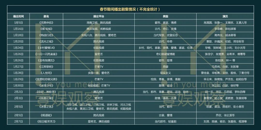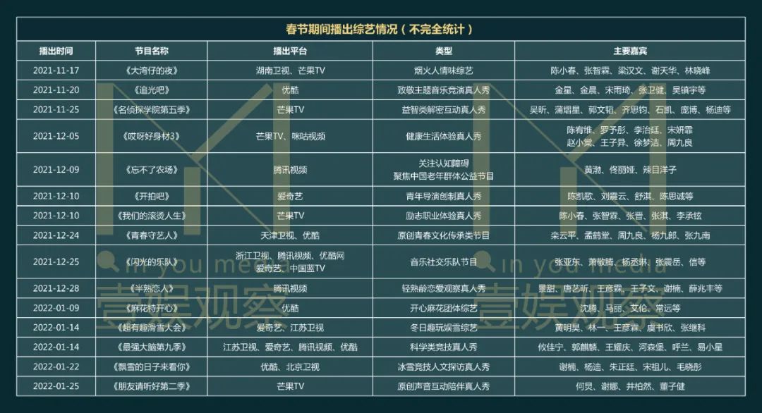 壹娱观察总结了春节期间视频网站在播和上新的剧集、综艺,发现优爱腾芒都为春节档中准备了多样内容。