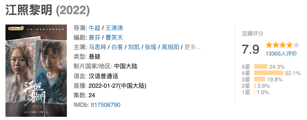 芒果TV“季风剧场”则上线了悬疑题材《江照黎明》,类型差异化之下,作品口碑持续发酵,豆瓣7.8分的开分成绩,也为“季风剧场”继《我在他乡挺好的》之后,再度迎来高分作品。