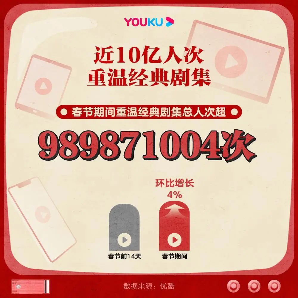 据优酷统计,2022年春节期间(1.25—2.6)近10亿人次重温经典剧集,经典剧集观看总时长近2亿小时。经典剧集也为视频网站的春节档贡献了不小的力量,也是视频网站在角力中重要的发力点之一,毕竟经典内容会持续吸引用户,在新内容乏力或难以突出重围的情况下,用户仍然可以为了这些内容留存下来。
