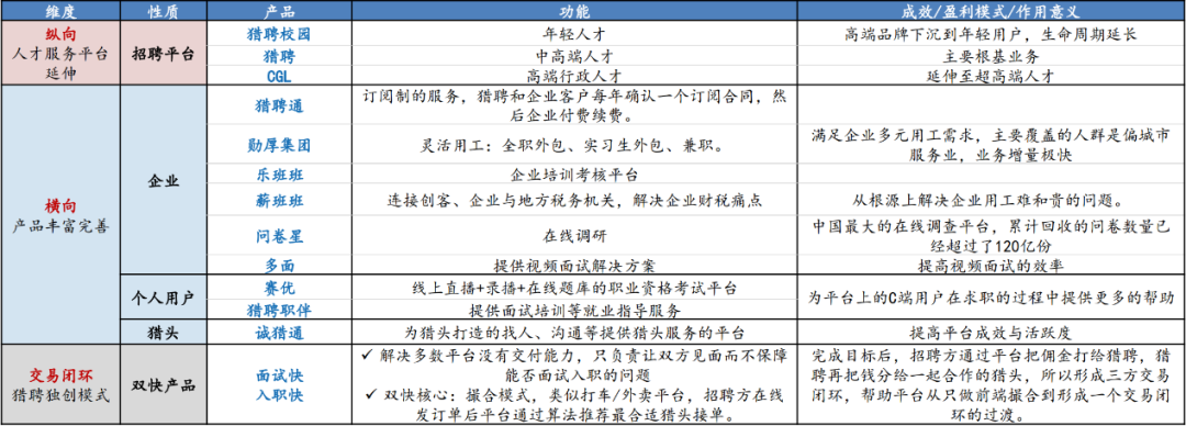 同道猎聘独创的“双快产品”——面试快、入职快——打造交易闭环,类似打车/外卖平台,招聘方在线发订单后平台通过算法推荐最合适猎头接单。解决多数平台没有交付能力(只负责让双方见面而不保障能否面试入职的问题)。除此之外,其在纵向/横向还有丰富的产品。