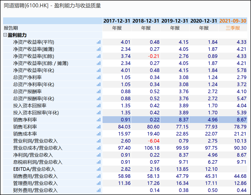 做白领蓝领招聘生意的前程无忧,2017-2020年净利润率13%-33%,2021年因为毛利率下降和销售费用上升,净利润率跌到个位数。