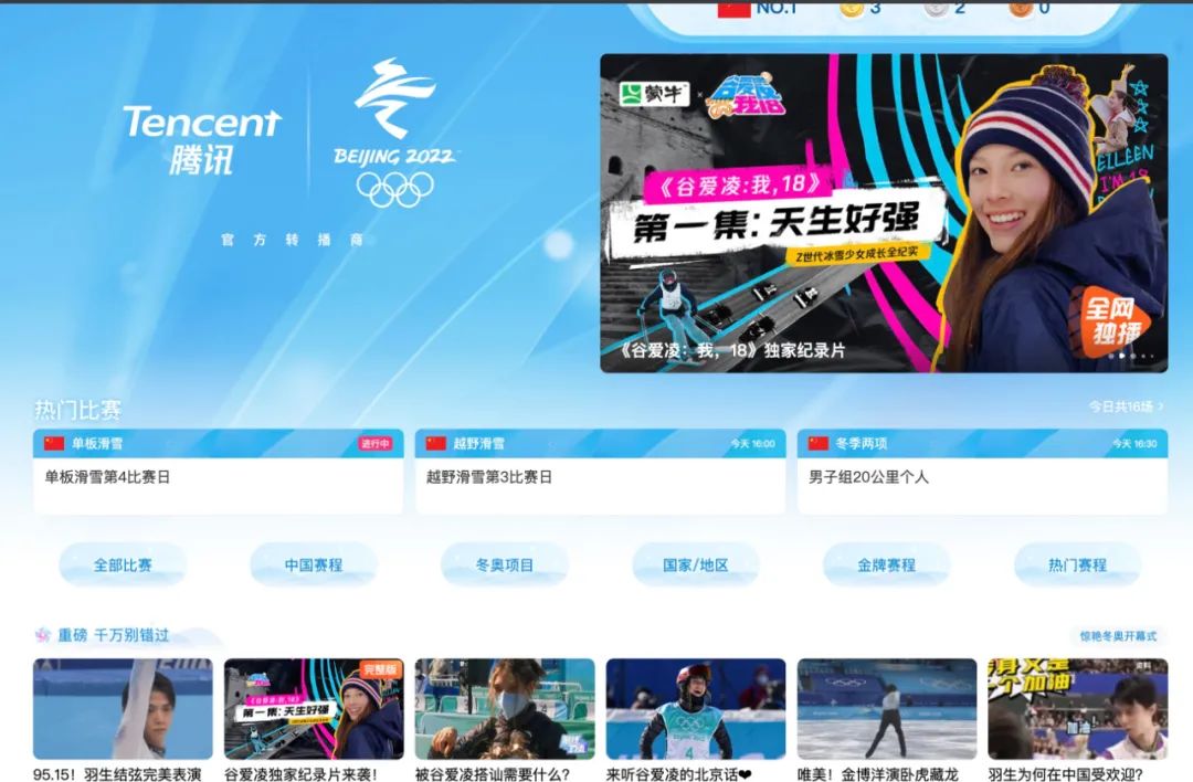 但这并不代表长视频平台的没落。除了手握赛事直播权优势的央视频、咪咕视频,腾讯视频此番在冬奥内容战场上仍占据重要位置。拿到冬奥赛事转播权的它,在腾讯视频、腾讯体育双平台皆开辟有多元内容形态的冬奥专区。