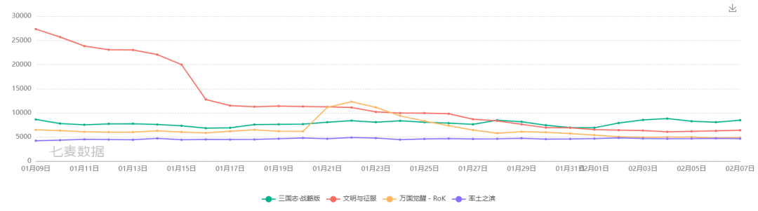 从总下载量看:阿里《三国志·战略版》在下载量领先,春节期间也交出了出色的成绩单,依然属于国内SLG标杆;值得注意的是,去年末才上线的《文明与征服》近三周合计下载量与《三战》基本并驾齐驱!可谓“后生可畏”。 从时间维度看:两款三国题材产品基本稳定,近一个月下载量没有出现明显波动,产品的稳定性非常出色。而《文明与征服》乘着上线热度下载量冲高,随着时间的推移,下载量趋向平缓,目前日均下载量仅次于《三国志·战略版》。