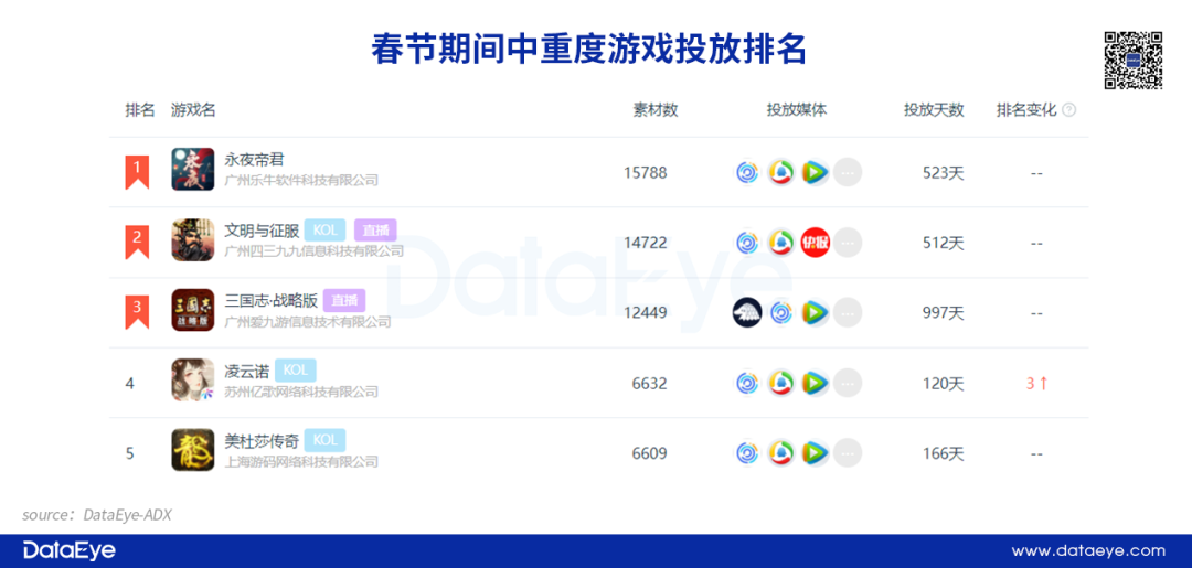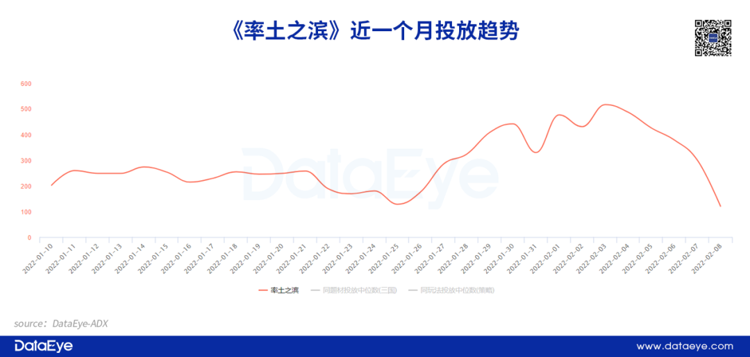 相比之下《万国觉醒》、《率土之滨》在效果广告投放层面并没有特别强势,但从大盘来看依然出色。《万国觉醒》在整个春节假期投放共投放素材约为2681组,排名中重度游戏榜单第13名;而上线长达6年的“老兵”《率土之滨》也在春节档加大投放力度,整个假期投放超过1100余组素材,凸显出对春节档的重视。
