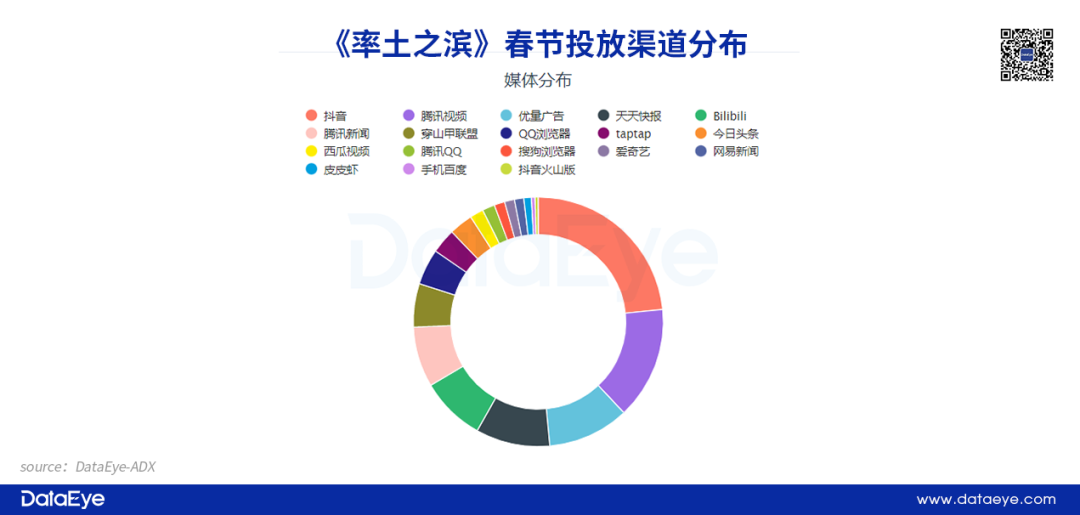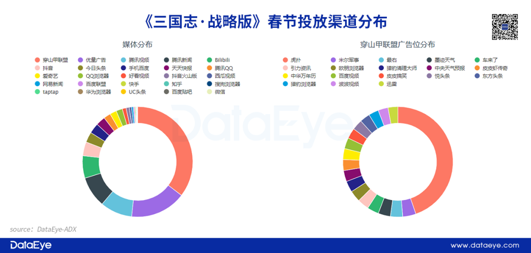 从投放渠道来看:突出投放范围广、针对性强两个特点。以投放量较高的《三国志·战略版》为例,春节假期投放渠道25个,穿山甲联盟比重较高,其次为优量广告和腾讯视频。《率土之滨》则以抖音作为主要投放渠道,腾讯视频和优量广告同样占据较高的投放占比。