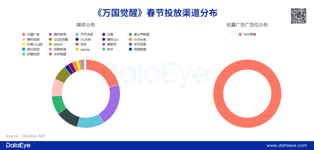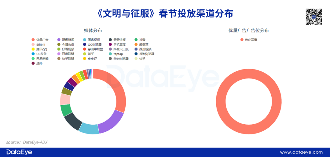 此外《文明与征服》投放渠道为26个,但与《万国觉醒》一样是以腾讯系的优量广告作为主要投放渠道,并且重点广告位同为“米尔军事”,强调用户属性的契合,针对性强的投放特点。