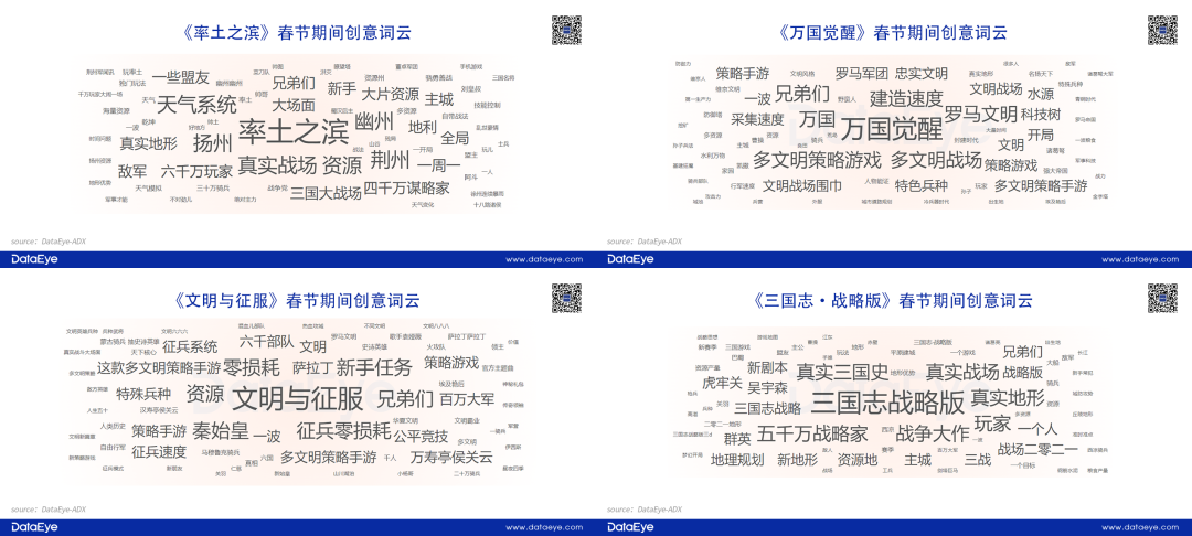 在创意内容上,各产品所展现出的思路也有所不同。例如《万国觉醒》多以游戏画面作为展示,通过表演形式展现游戏内容;《文明与征服》加多真人剧情表现,包括情景短剧和代言人新春拜年的形式作为创意素材;而《三国志·战略版》依然讲究品效合一的营销理念,增多玩家与游戏的故事内容,寻求用户情感共鸣。