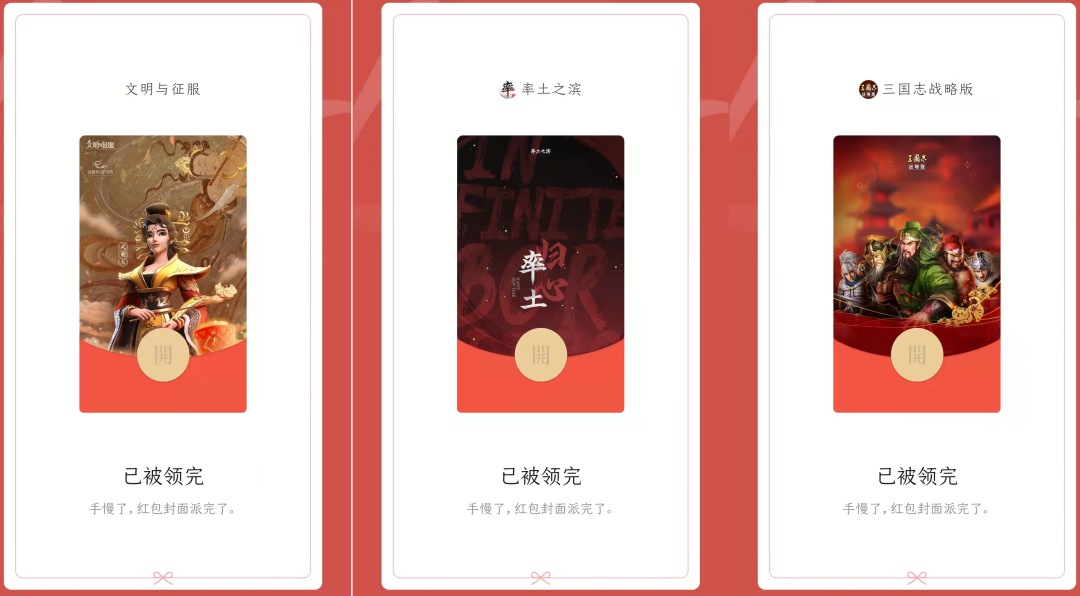 2022年春节档SLG手游厂商在社会化营销阶段更呈现出不同的营销思路。作为SLG头部厂商,多元化的营销道路更是旗下产品试图打造差异化的体现。通过对春节档各产品的社会化营销,可以总结出三个关键词: 关键词1:微信红包。微信红包封面自2021年开始已经成为游戏厂商其中一个必备营销内容,根据2022年春节数据显示,带有封面的微信红包收发总数超过50亿。巨大的红包封面基数,足以让产品在短时间内取得品牌和产品的曝光增长和搜索指数上涨。