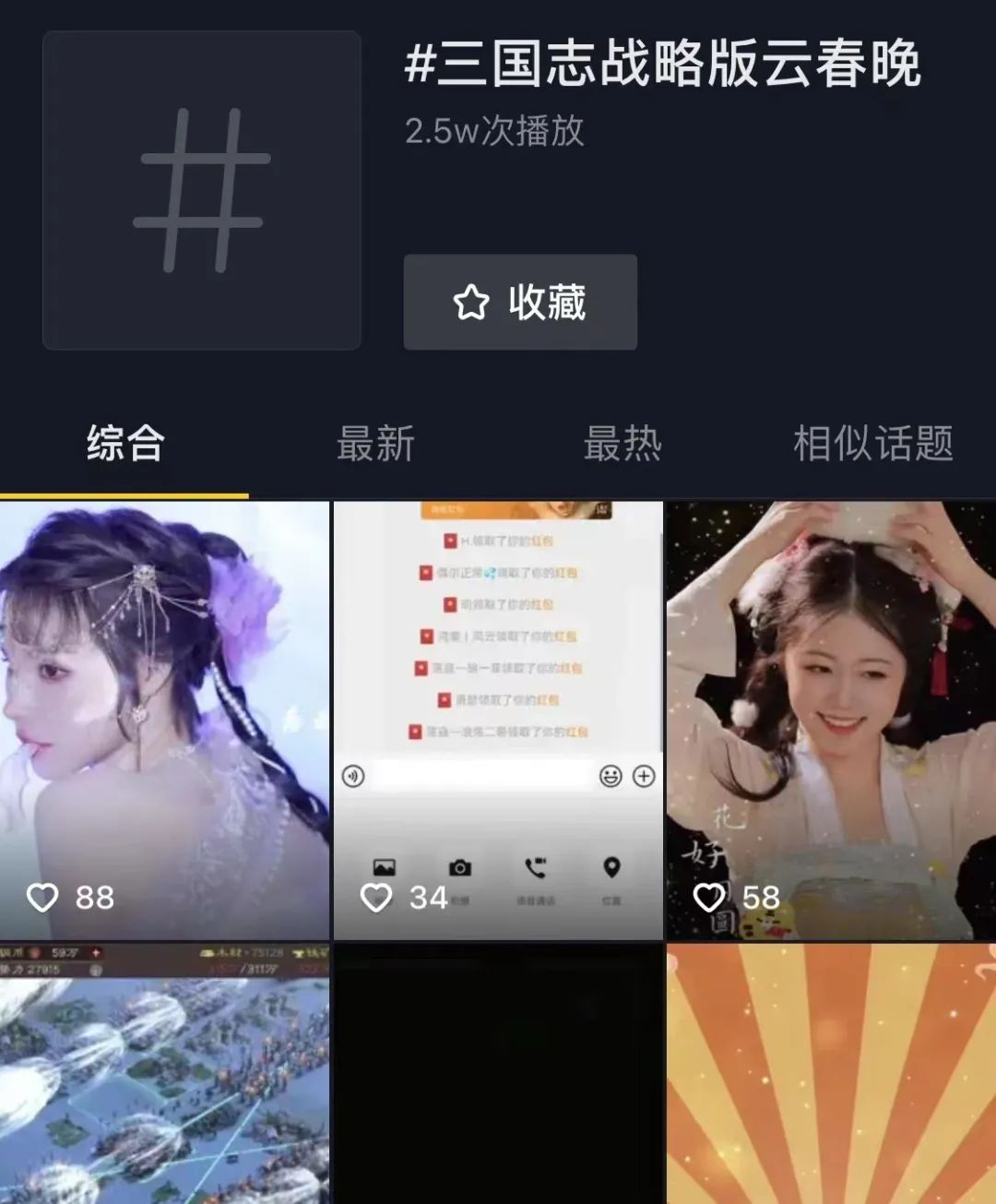 同时在抖音平台发起#三国志战略版云春晚 话题,试图让更多用户通过抖音平台了解游戏内容以及游戏文化。但观察发现,整体播放量并不理想,话题播放量仅为2.5W次。