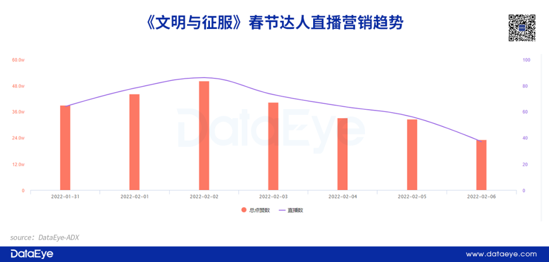 根据DataEye-ADX达人营销数据显示,《文明与征服》在春节档却保持了较高的达人直播数量,春节档期间共直播超过400场,成为国内达人直播营销榜第一。数据统计显示,整个春节期间直播总点赞数约为262.3W,但最高在线人数仅有1.9W人次。
