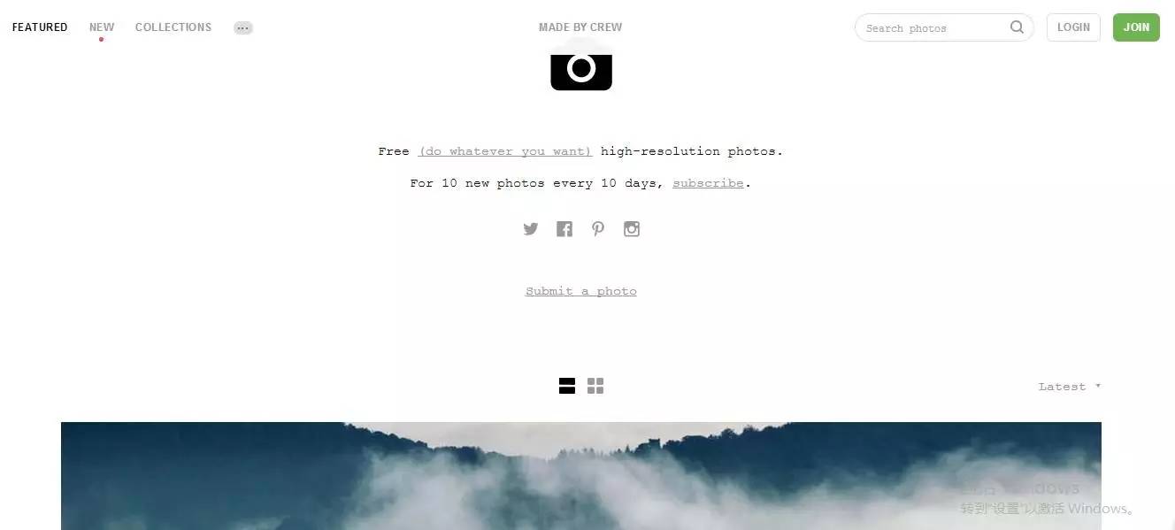 Unsplash是免费的高分辨率图片的集合,无疑是最好的图片资源网站,用来做网页图片素材都已足够。该网站每10天更新10张照片,值得收藏。