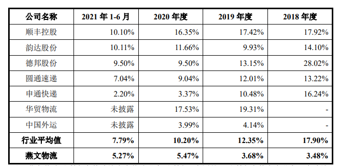招股书显示,燕文物流2020年处理票件量达7.17亿件,2021年1-6月处理票件量达5.07亿件。报告期内(2018-2021年6月),燕文物流归母净利润分别约为0.15亿元、0.30亿元、1.48亿元和0.62亿元,复合增长率为207.90%。
