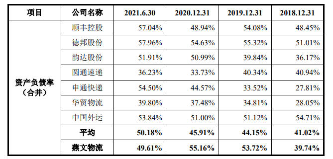 燕文物流报告期各期末,公司负债总额分别为2.27亿元、5.57亿元、7.78亿元和6.68亿元,对应的资产负债率分别为39.74%、53.72%、55.16%和49.61%,普遍高于行业平均值。