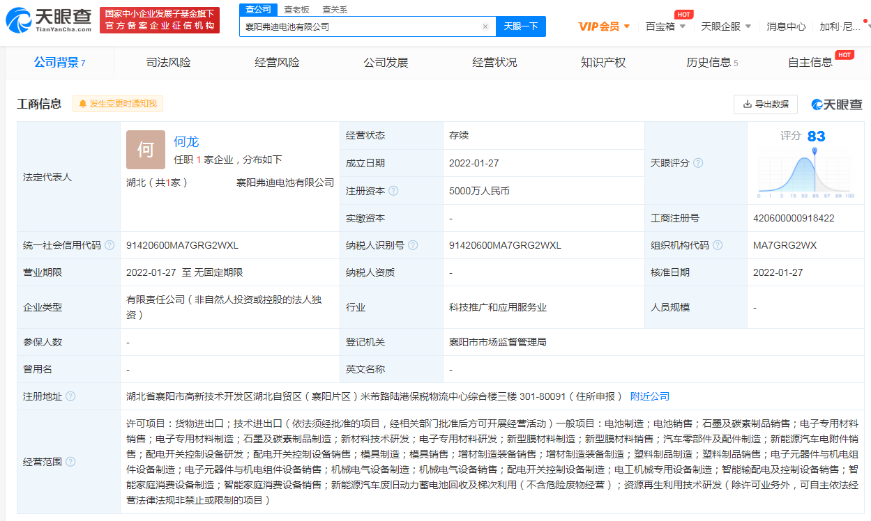 据天眼查App显示,近日,襄阳弗迪电池有限公司成立,法定代表人为何龙,注册资本5000万人民币,经营范围包括电池制造;电池销售;新材料技术研发;电子专用材料研发;机械电气设备制造等。股权穿透图显示,该公司由比亚迪股份有限公司间接全资控股。