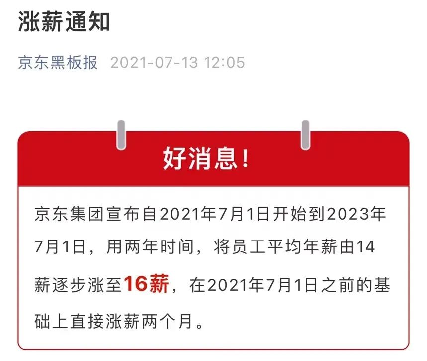上述员工提及的“公告”,实则是京东集团在2021年7月13日宣布的“涨薪通知”——自2021年7月1日开始到2023年7月1日,用两年时间,将员工平均年薪由14薪逐步涨至16薪,在2021年7月1日之前的基础上直接涨薪两个月。