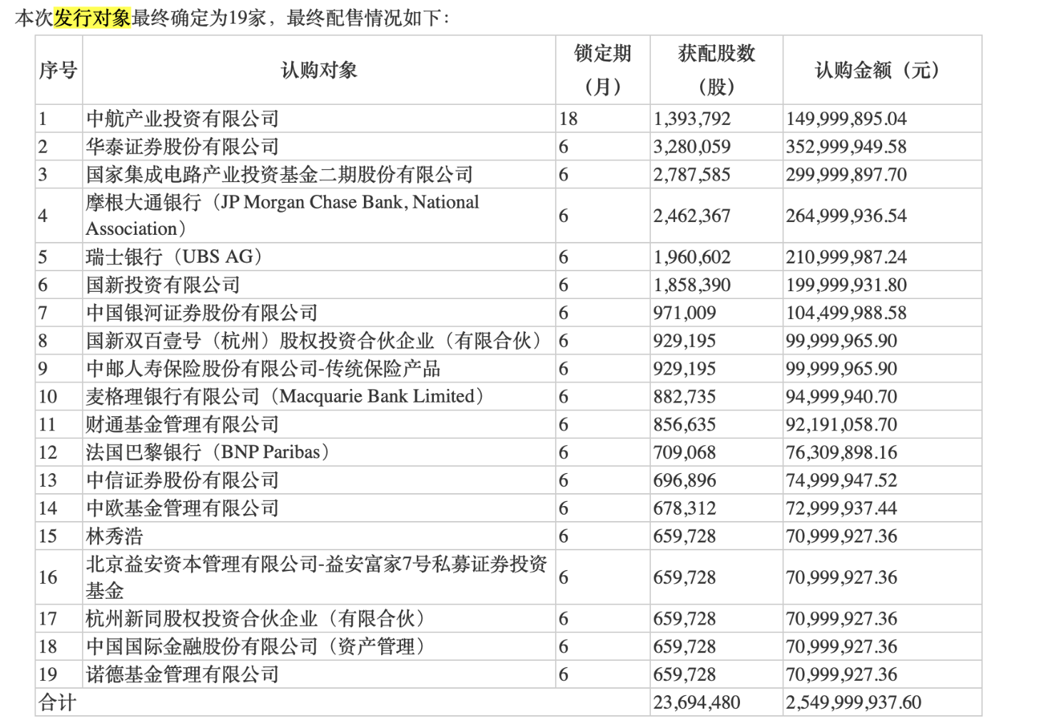 此次定增中,华泰证券认购数量最多,总共花费3.53亿元认购328万股。同时,“国家队”大基金二期也花费3亿元认购278万股。