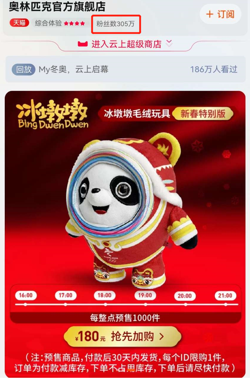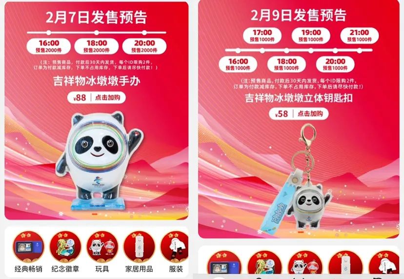 2月4日以来,奥林匹克官方旗舰店连续多次进行冰墩墩徽章、钥匙扣等产品的补货,上线便被秒空。2月9日,奥林匹克官方旗舰店上线了“新春特别版”冰墩墩绒毛玩具,自下午4点开始每个整点1000件放量预售,这引发大批网友进入店铺秒杀。