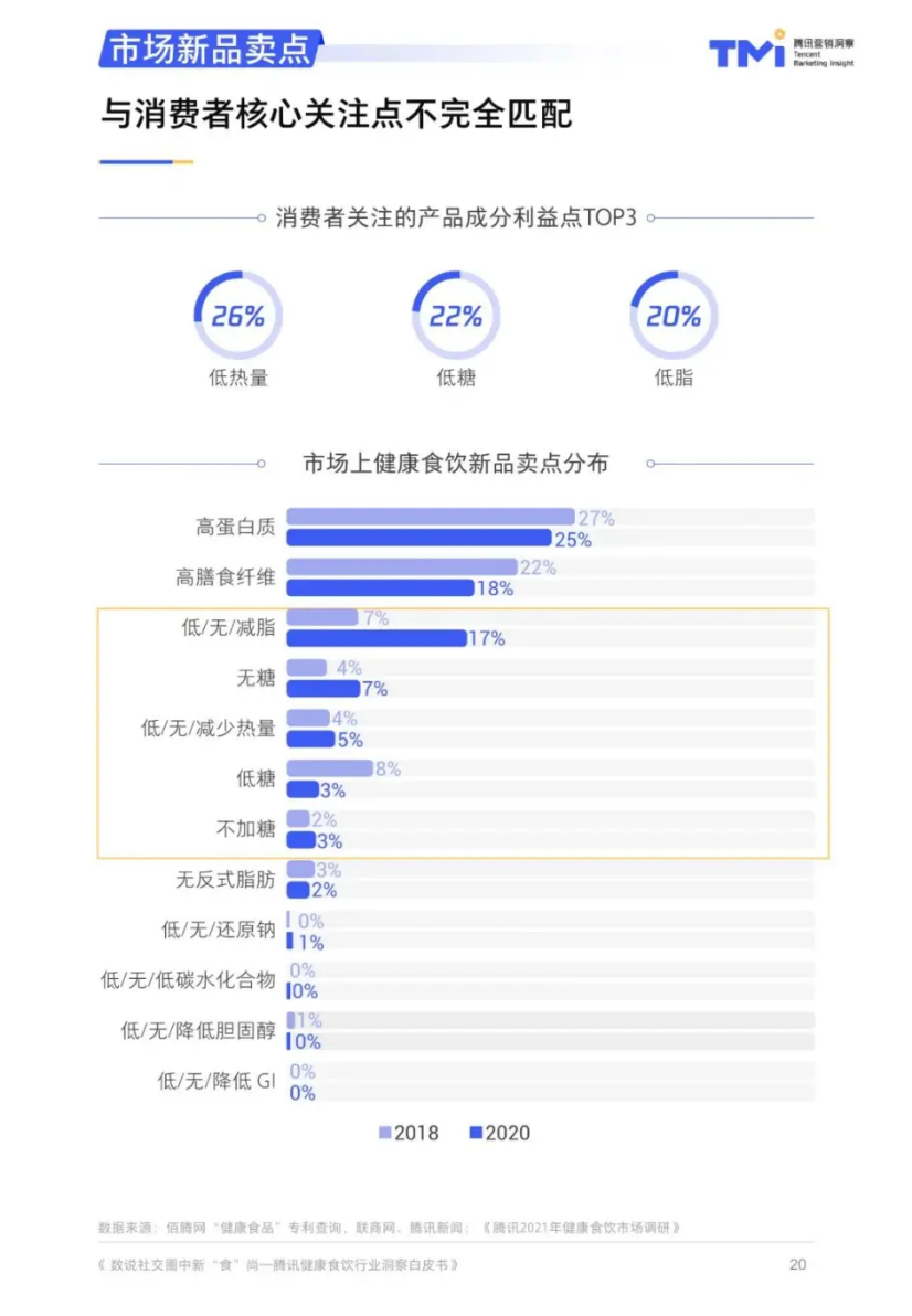 纵贯市场,产品包装上的蛋白质含量标识愈发显著,平均蛋白含量也不断上涨。腾讯发布的《2021健康食饮行业洞察白皮书》指出:高蛋白已经跃升为健康饮食卖点的第一位。