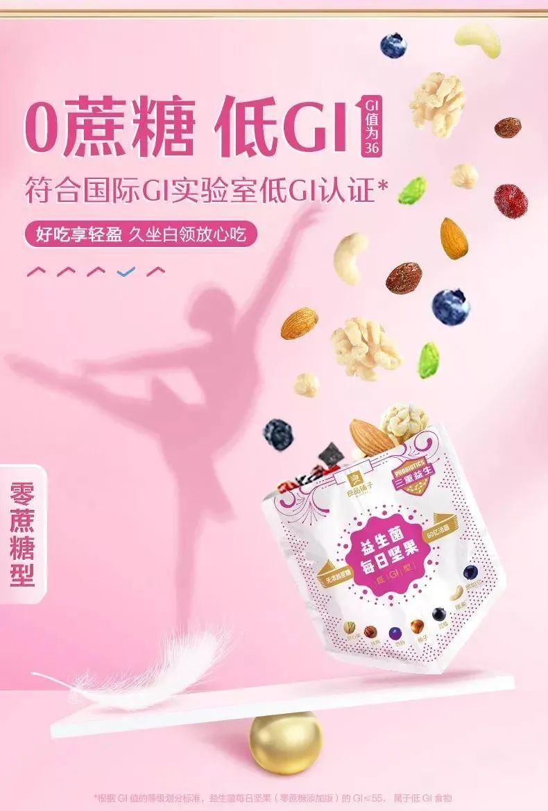 多数果干被糖腌渍后过甜,这对糖尿病患者、泛健身白领、孕期妈妈等控糖人群不够友好。良品铺子选用果汁代替白砂糖腌制果干,推出一款无蔗糖添加、主打低GI的益生菌每日坚果果干。2021年3月,该产品被国际GI数据库收录,成为坚果行业首个由国际GI实验室权威认证的低GI产品。