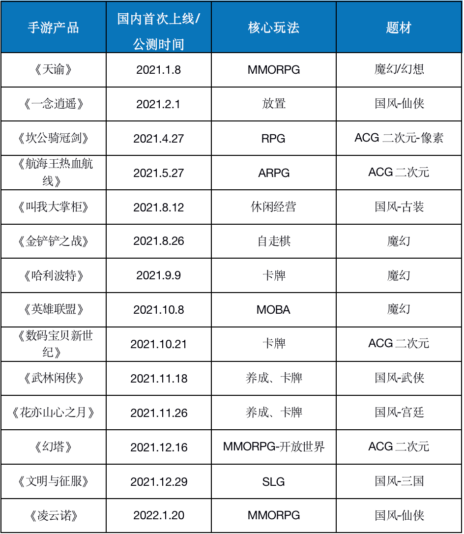 首先,选游戏。我们选取了2021至今上线/公测的14款较高知名度手游,这些游戏背后是最顶级的游戏公司、发行公司,是游戏业最有经验的人才。这些游戏也基本涵盖了MMORPG、ARPG、SLG、MOBA、放置、卡牌、休闲经营等玩法,同时涵盖了国风(仙侠、武侠、三国、宫廷)、ACG二次元、魔幻/幻想等主要题材。