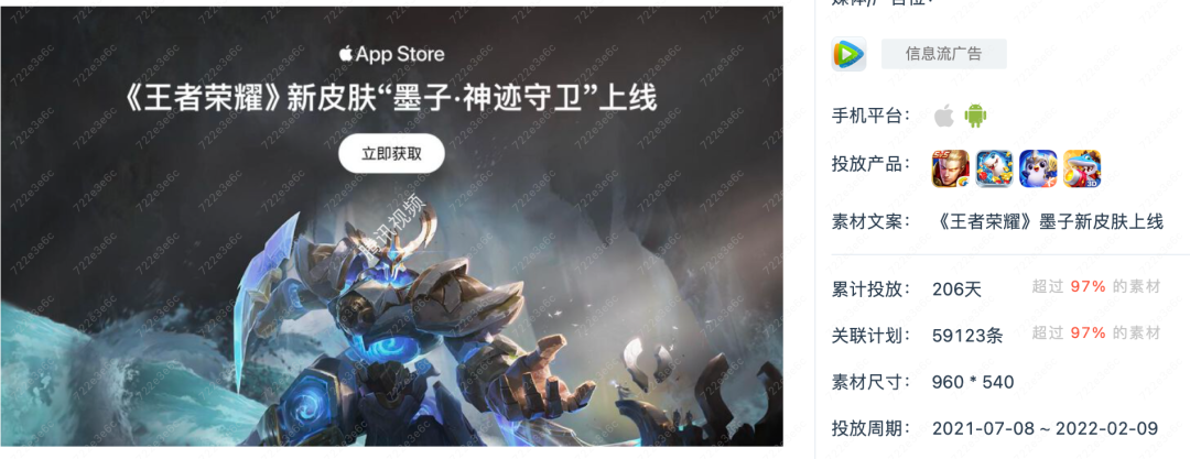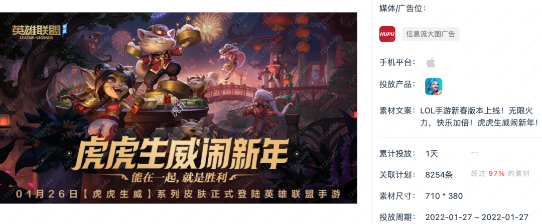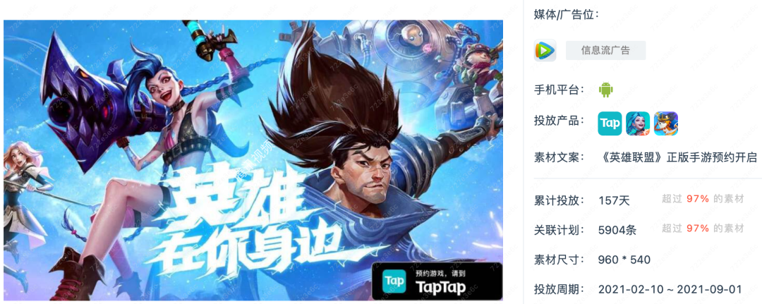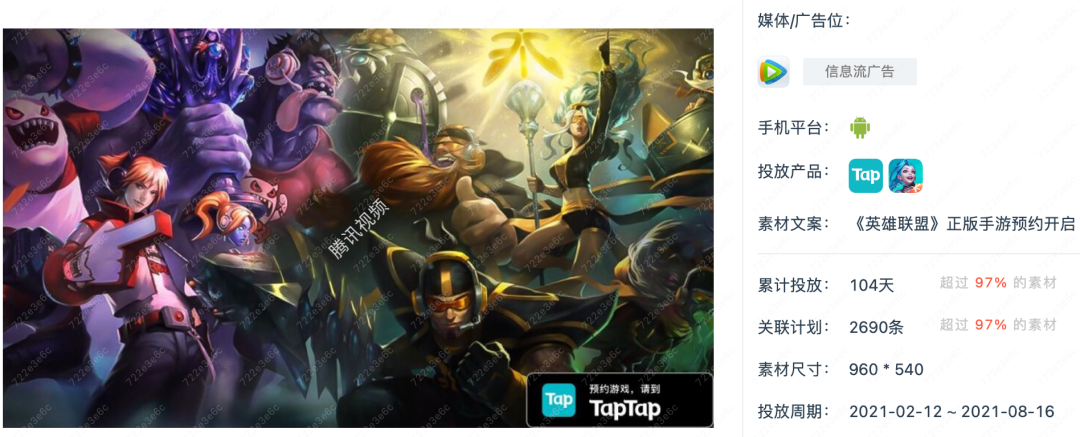 腾讯的买量素材更倾向于品牌广告,往往是一张画面精致的游戏海报,投放于腾讯系平台。《英雄联盟》、《金铲铲之战》《数码宝贝新世界》共计18组素材,有17组为游戏海报,其中10组投于腾讯视频、4组投于腾讯新闻。