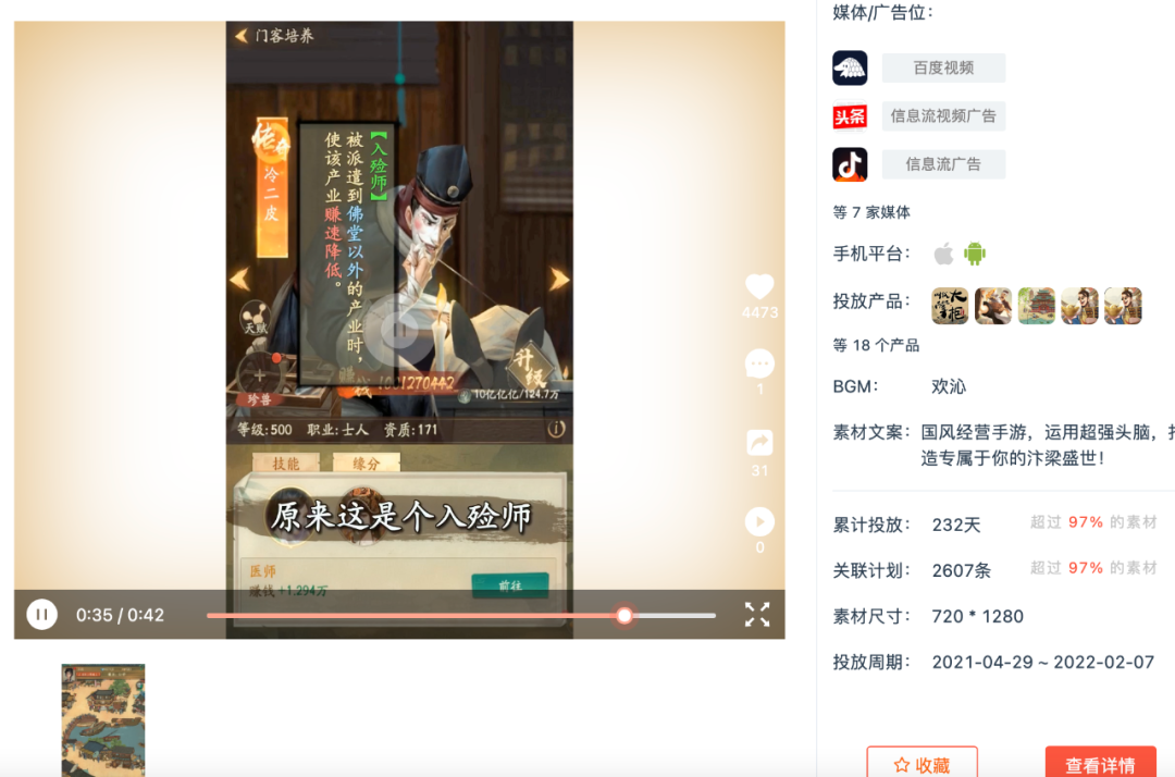 2021年以来,使用天数TOP1来自《叫我大掌柜》视频素材《国风经营手游,运用超强头脑,打造专属于你的汴梁盛世!》该广告投放长达232天,投放于穿山甲联盟、今日头条、抖音火山版等7家媒体,且共同投放产品高达18家,可谓“组团买量”。