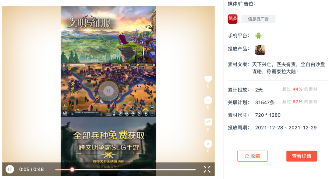 2021年以来,计划使用TOP1来自《文明与征服》视频素材《天下兴亡,匹夫有责,全自由沙盘谋略,称霸泰拉大陆!》该广告关联计划高达31547条,投放于网易新闻信息流。