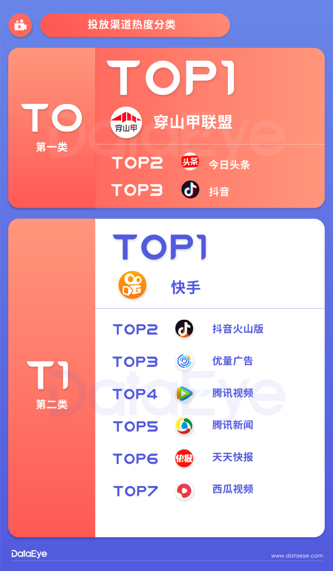 图片往往投放于资讯类APP,比如UC头条、网易新闻、腾讯新闻、虎扑、TapTap;而游戏素材包装类短视频,往往投向字节系产品(主要是抖音、今日头条、西瓜视频)。这背后也反映出字节系产品分发效率的持续增强,以及整个行业流量分散化、圈层化以及下沉的趋势。