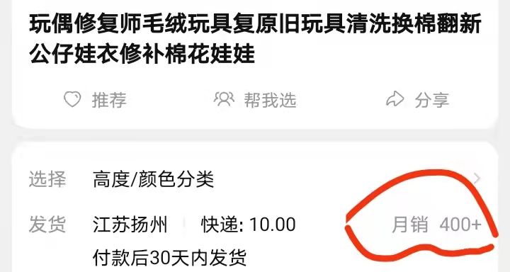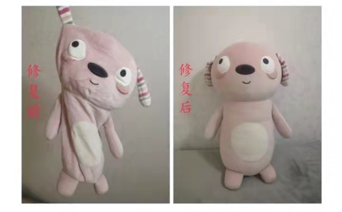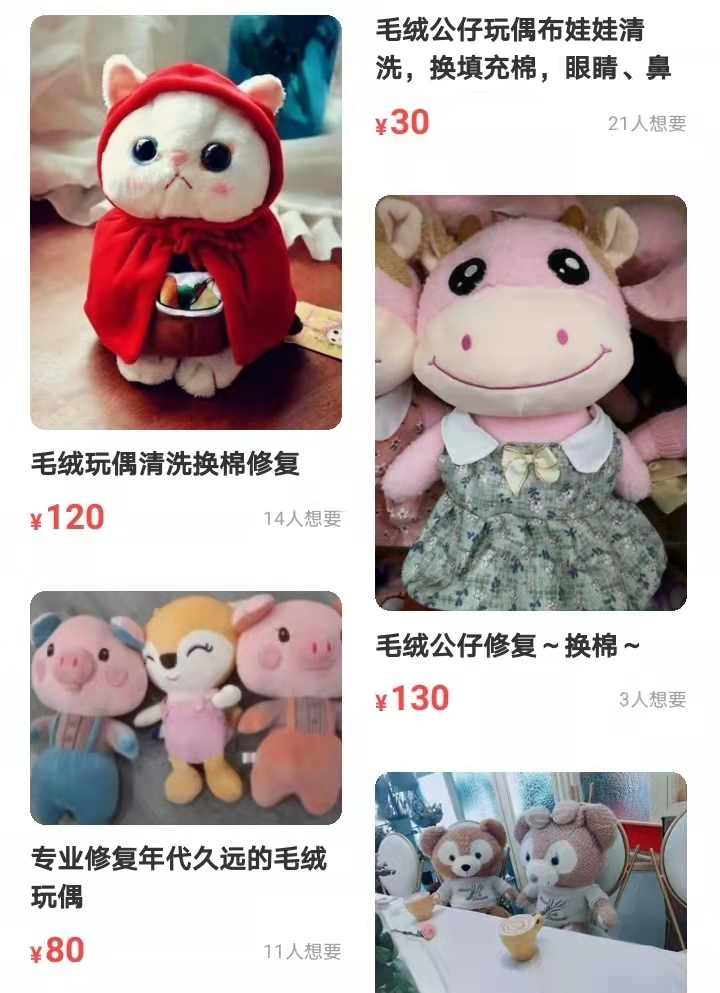 根据在电商平台上能搜索到的玩偶修复服务,修复一个娃娃的时长和费用,取决于娃娃的破损程度、大小、材料的稀缺性、出产年份等等。因为每个承载着主人记忆的娃娃都是独一无二的,修复师需要不断根据主人的需求修改完善,到材料市场比对,工作量是不小的。所以基本上修复一个娃娃都需要起码一周时间,有的甚至需要一个月,费用自然也不菲,100元仅是起步价,200元到500元是常态。