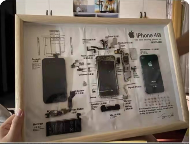 装裱所使用的工具,也有讲究。比如,零件旁边的文字,需要使用高精度特种印刷机印刷在底板上,而不是普通工业或家用打印机;粘零件的胶水最好是纳米进口级别,非常牢固;相框是纯实木的,还要是传统榫卯工艺的。根据闲鱼上的数据,一般装裱一台手机需要200元。