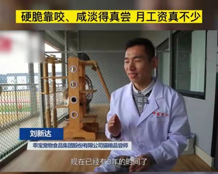 实际上,更为靠谱的可能性是,这些猫粮品尝师其实是宠物食品公司的宠物食品研发人员。比如这位: