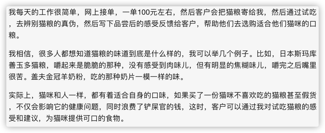 可以说,猫粮品尝师,并非只是品尝猫粮那么简单。毕竟如果当真是每天在平台上接单,不断试吃客户寄过来的各种各样的猫粮,是有不小健康风险的,而且目前这一职业还未有统一的行业规范,根本无法判断从业者的资质。