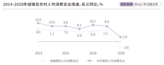 《2021新国货白皮书》显示,下沉市场人群生活压力相对较小,开始注重追求品质生活。电商平台通过“低价+拼团”模式,获得了来自下沉市场的增长红利。即使面对疫情冲击,农村人均消费支出依然实现2.9%的正增长,明显好于城镇居民3.8%的下滑。