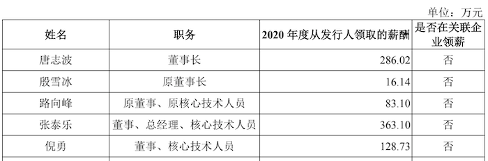 2020年,唐志波从公司领取薪酬高达286.02万元,彼时原董事长殷雪冰、原董事兼原核心技术人员路向峰薪酬分别为16.14万元和83.10万元。