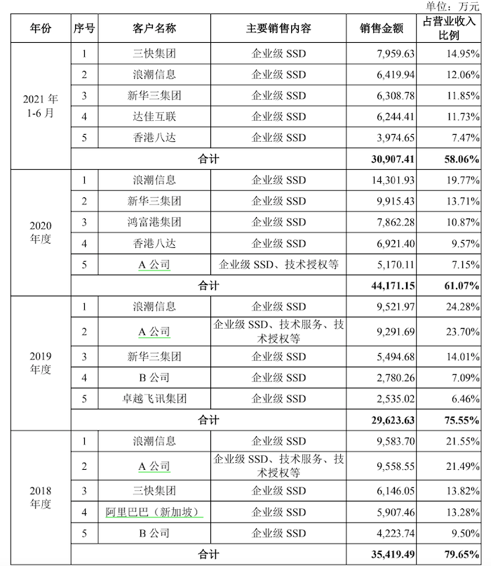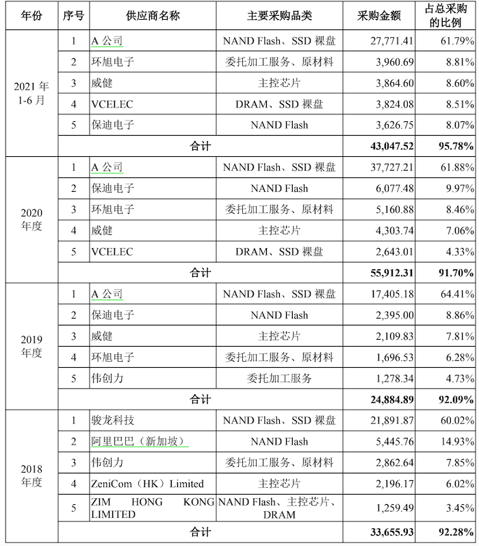 2019年、2020年及2021年前6个月,忆恒创源从A公司采购NAND Flash、SSD裸盘金额分别为1.74亿元、3.77亿元和2.78亿元,均占当期采购总金额的六成以上,存单一客户依赖风险。