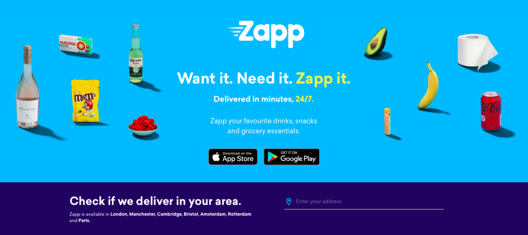 Zapp成立于2020年,主打食品杂货即时配送。目前在曼彻斯特、剑桥、布里斯托尔、阿姆斯特丹和鹿特丹多地运营,并计划在巴黎进行软启动。